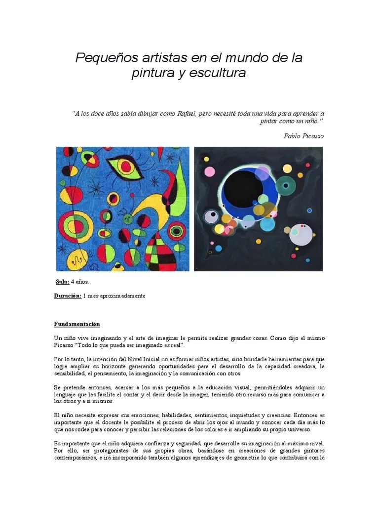 Diseñar situaciones de enseñanza en la que la observación y el análisis de la imagen permitan a los niños avanzar en sus posibilidades de apropiación y producción... Un color agudo para una forma no aguda. Diseñar situaciones de enseñanza en la que la observación y el análisis de la imagen permitan a los niños avanzar en sus posibilidades de apropiación y producción. No le importaba nada que hubiese una casa, una ciudad o una señora corriendo, para él lo importante eran los colores que allí se concentraban y la fuerza que en su combinación adquirían en la obra. 29.03.2016 · camino a la abstracción. Les dejo algunas ideas para trabajar con los niños,la idea es se inicien en la exploración visual de formas y figuras a partir del conocimiento de la obra de kandinsky. Arte abstracto para niños con kandinsky este proyecto fácil y didáctico, anima a los niños a ver que el arte está creado de muchas maneras. 19.09.2016 · pintura con los sentidos: