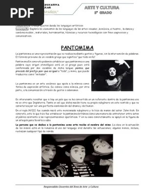 Se conoce como mmica, por otra parte, a la comunicacin a travs de gestos o ademanes. Por el otro lado tambin otras artes … Muchas veces la pantomima usa otras herramientas expresivas, como la danza, el teatro negro, teatro de objetos, mscaras o elementos clownescos. El trmino proviene de un vocablo griego que significa que todo imita. Distribución artes escénicas :teatro, música y danza. Pantomimo (griego pantmimos que todo imita) es la parte de las artes escnicas que utiliza la mmica como forma de expresin artstica. Se conoce como mmica, por otra parte, a la comunicacin a travs de gestos o ademanes... Esta forma de representar surgió ante la decadencia del teatro de la palabra en forma semejante a lo acontecido en grecia y en roma.